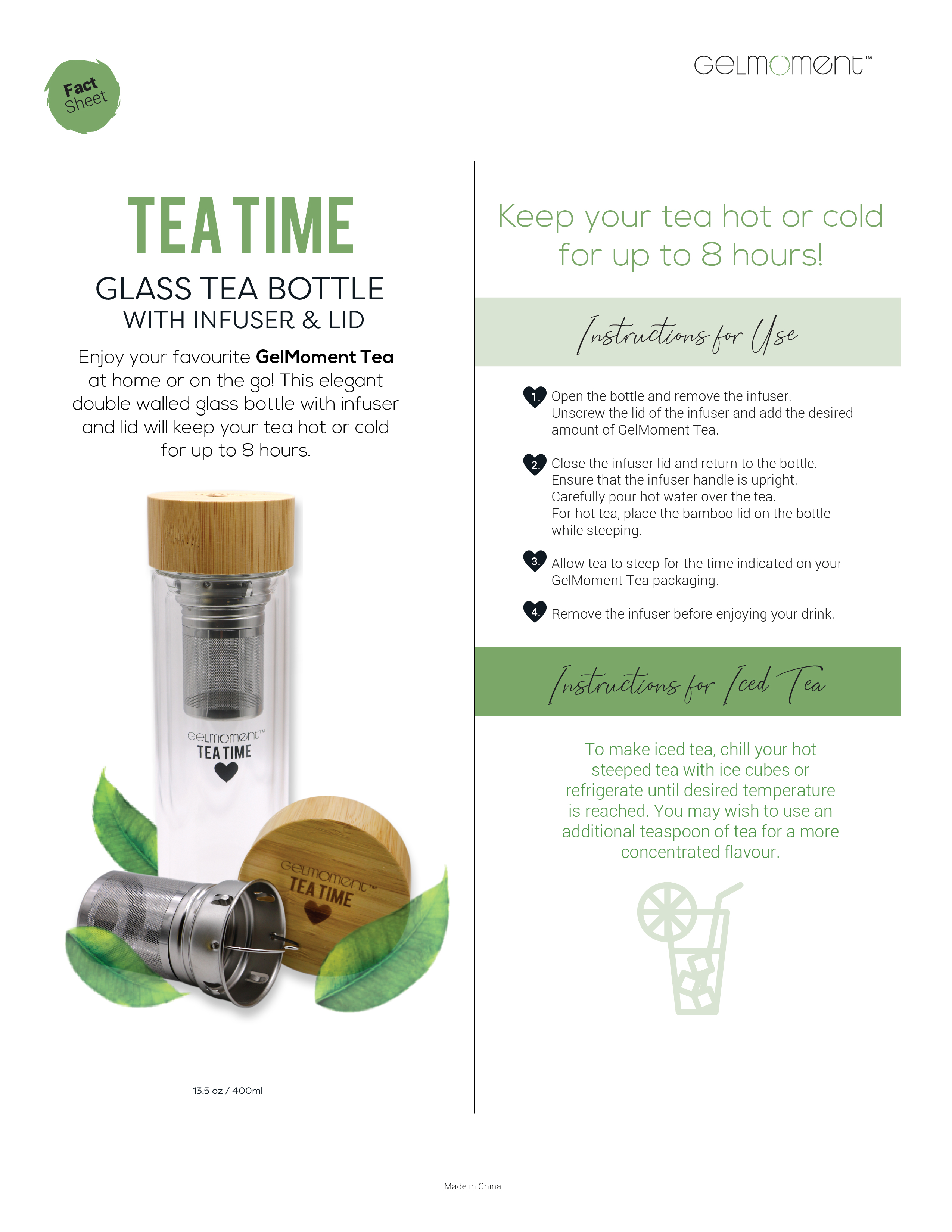 Enjoy your favourite GelMoment tea at home or on the go! This elegant double walled glass bottle with infuser will keep your drink hot or cold for up to 8 hours.